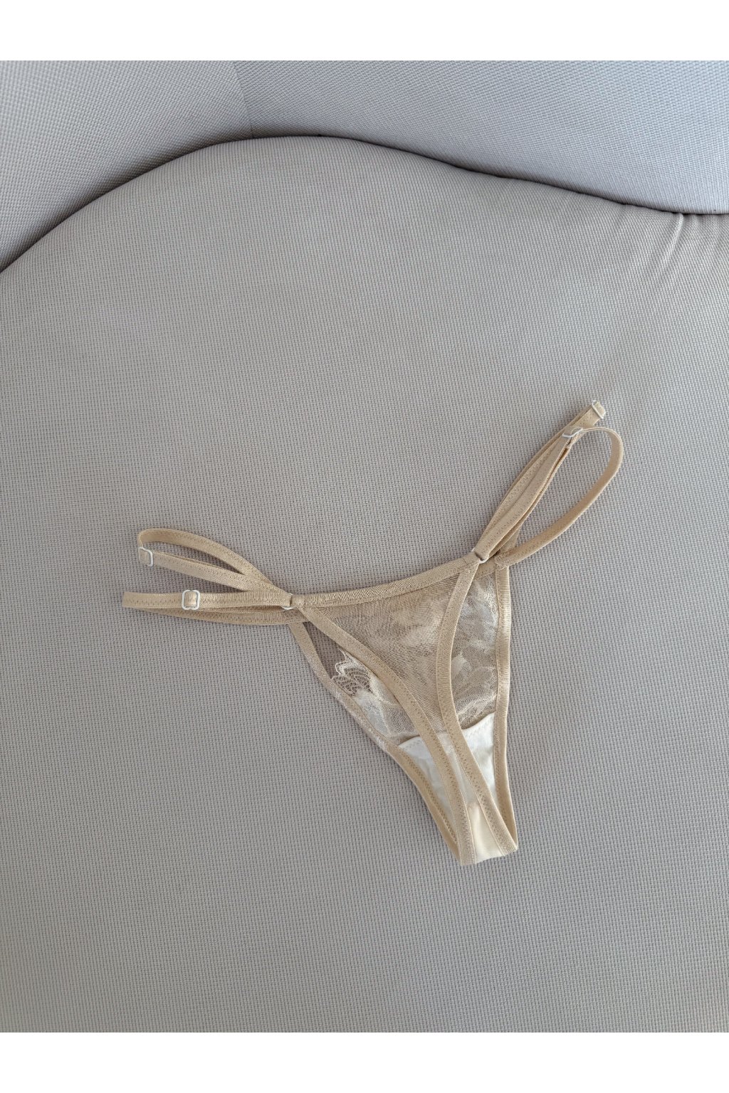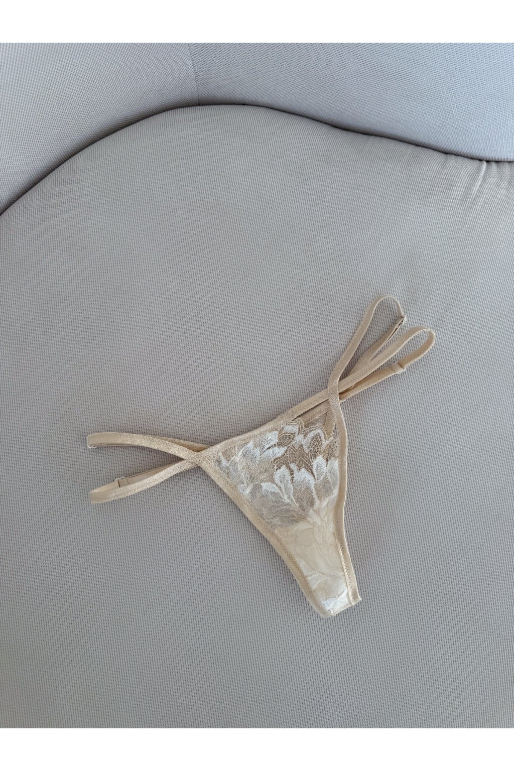 Tanga z jemné nude krajky s bílým detailem jsou navržená tak, aby ladila s tvým tělem i náladou.