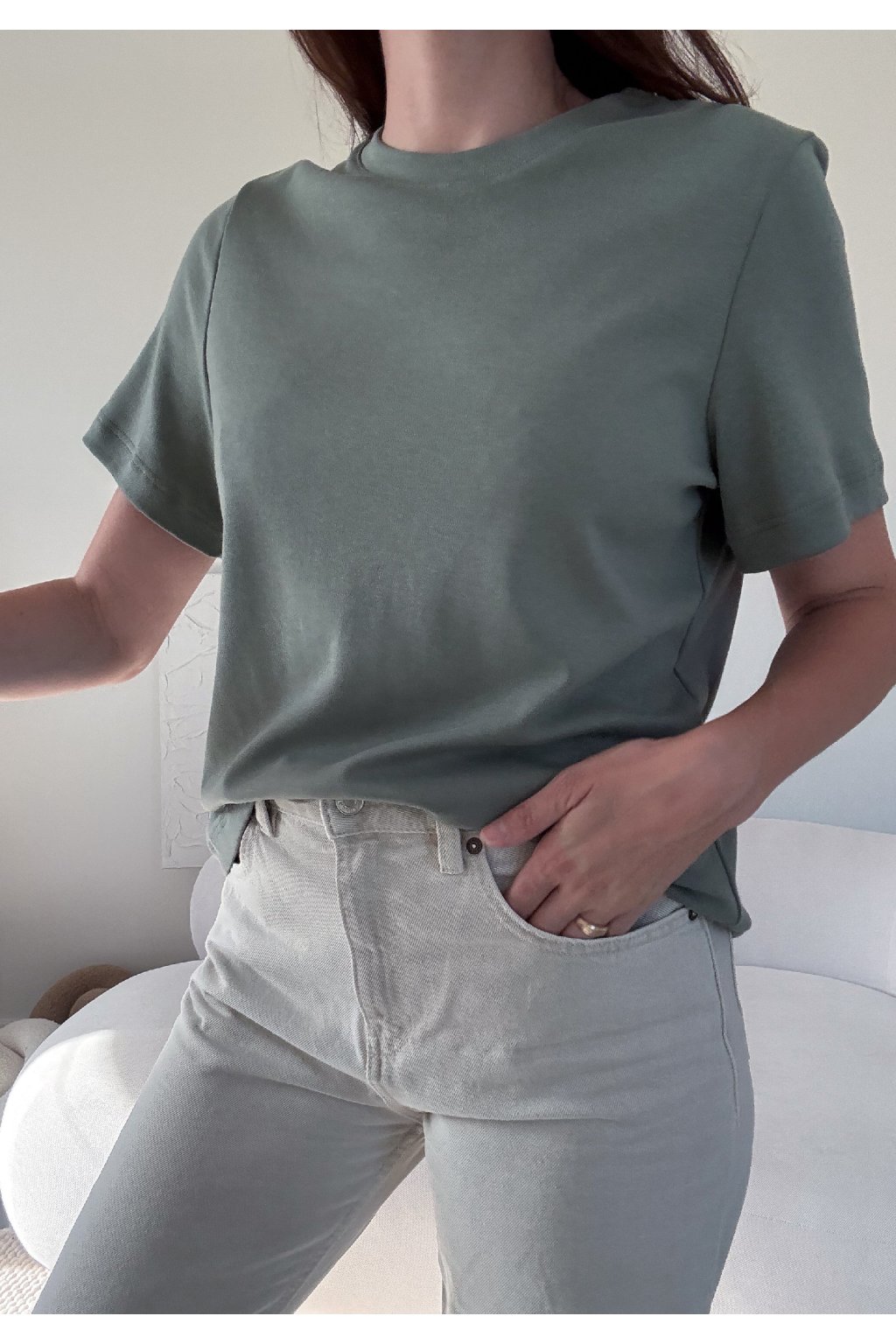 Outfit Saver Tee je esencí každodenní stylovosti. Ušité z vysokogramážního úpletu z bambusu a bavlny. Na těle krásně drží tvar, a přitom splývá s lehkostí. Lehce volnější střih a dokonale řešený rukáv lichotí každé postavě – ať ho zastrčíte do kalhot, nebo necháte volně přes boky.