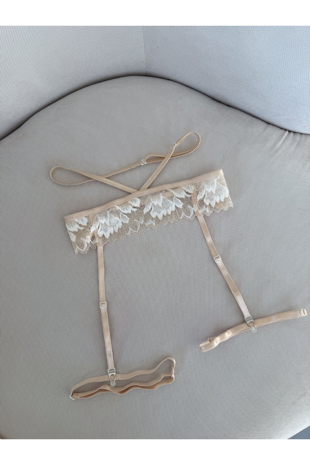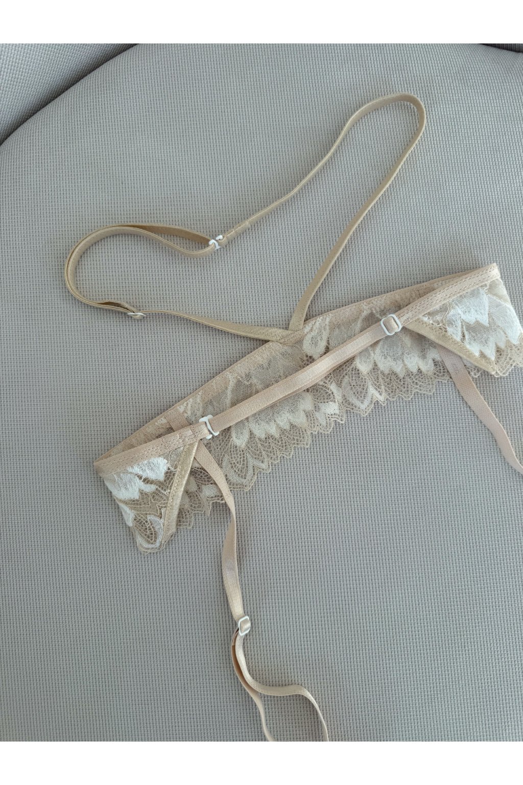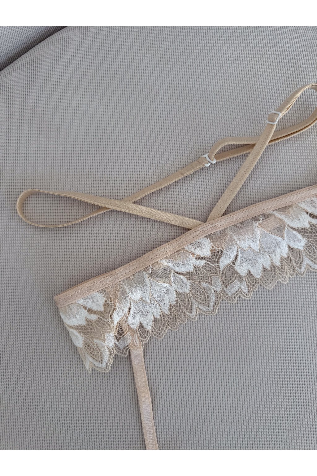 Jemná krajka v nude odstínu s bílým detailem působí čistě a elegantně.