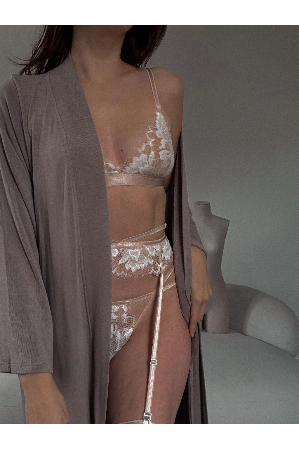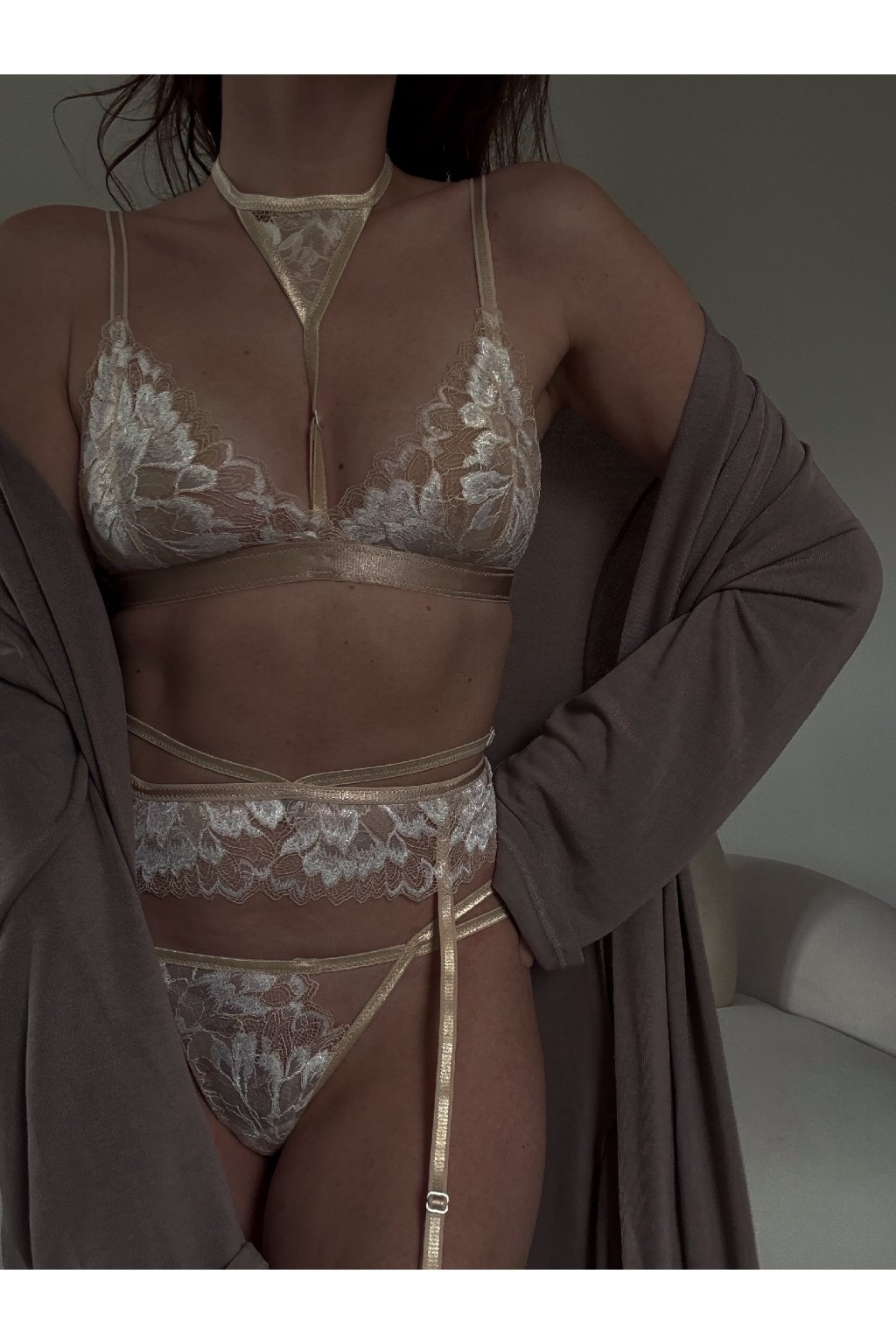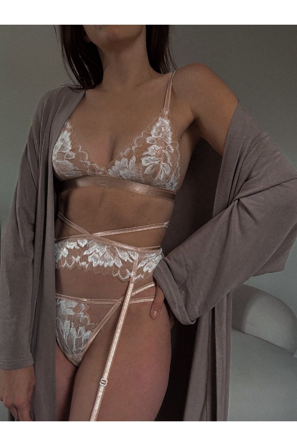 Jemná krajka v nude odstínu s bílým detailem působí čistě a elegantně.
